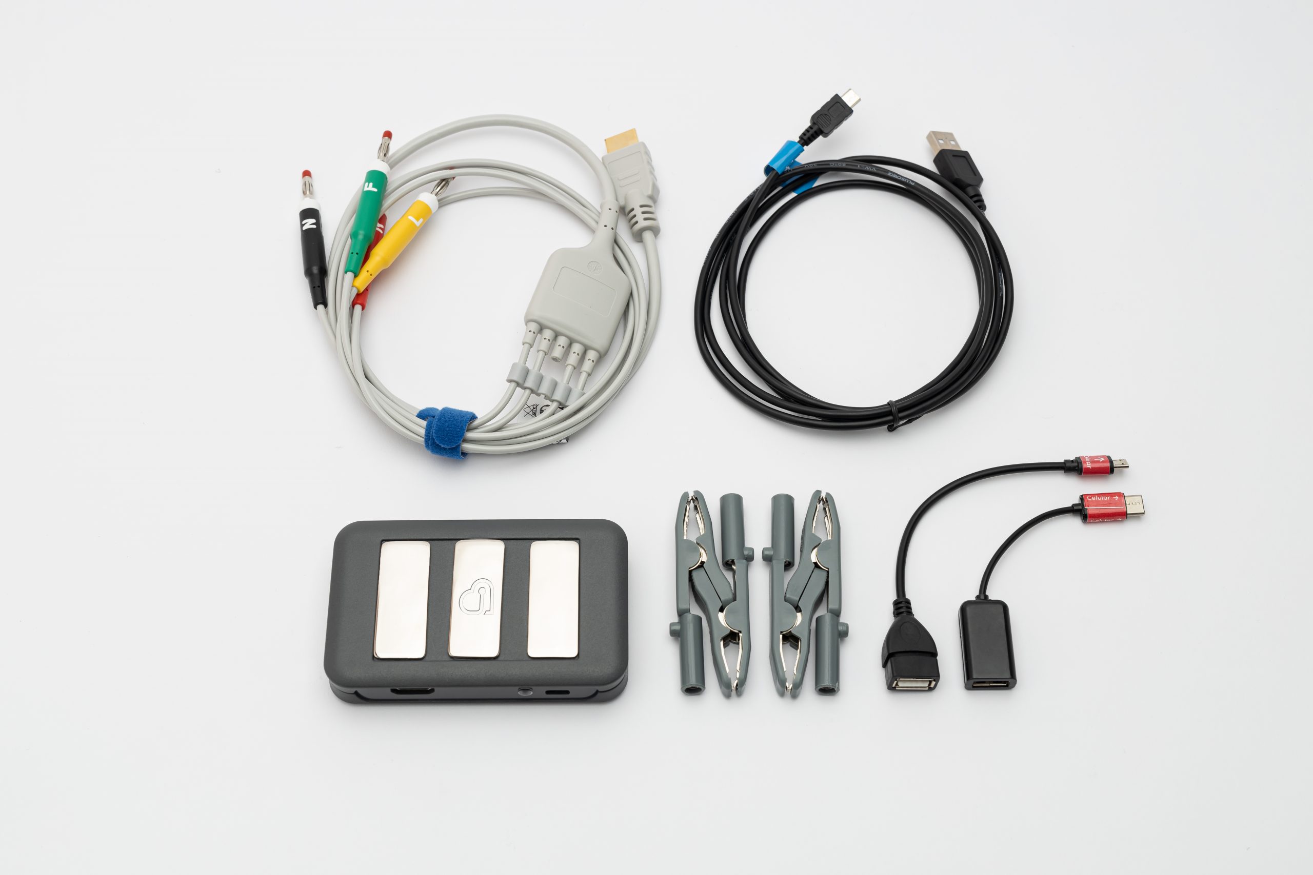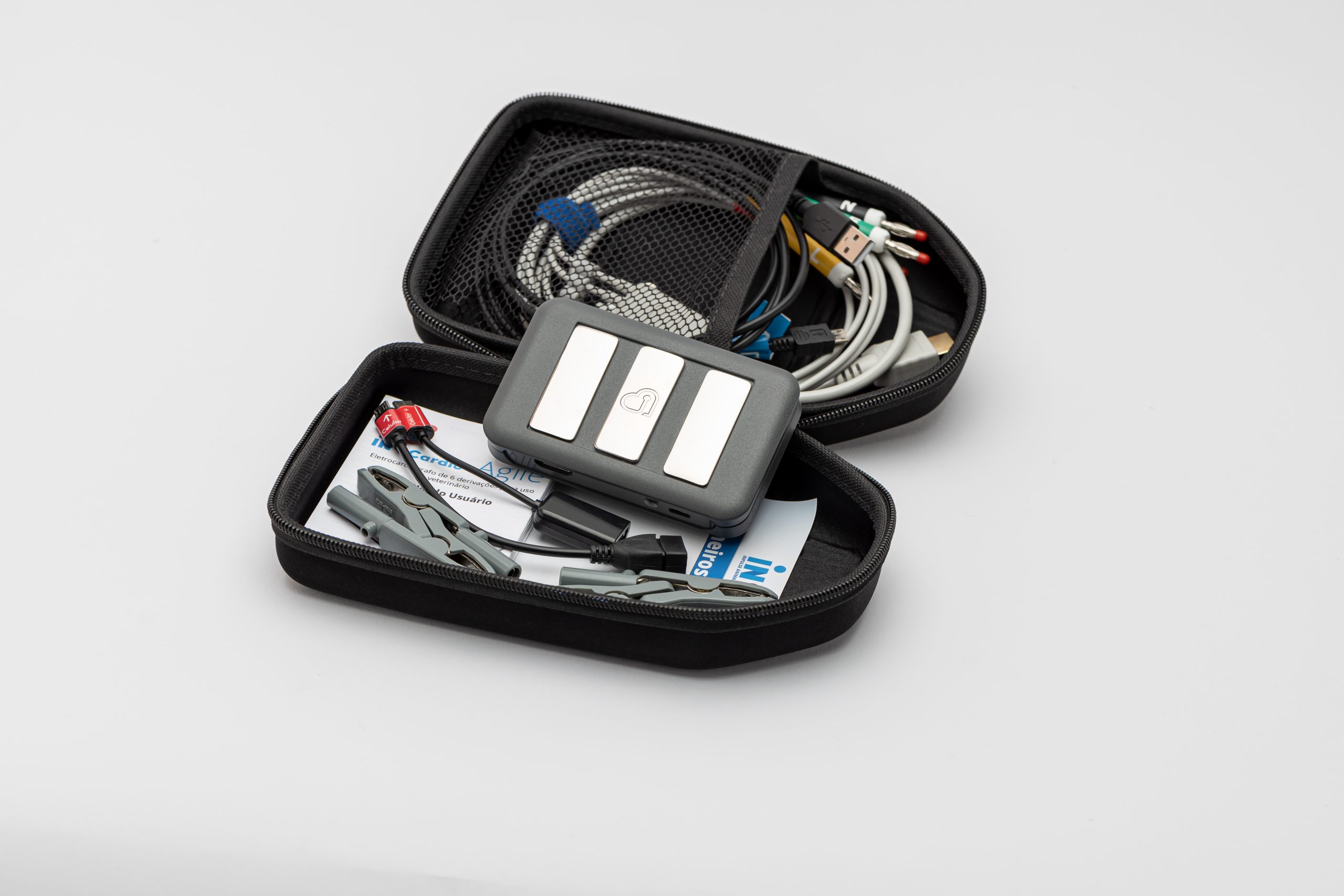 Contenido del paquete: Electrocardiógrafo INcardio Agile, cable USB, cable ECG de 4 vías, 4 electrodos cocodrilo, estuche de transporte.