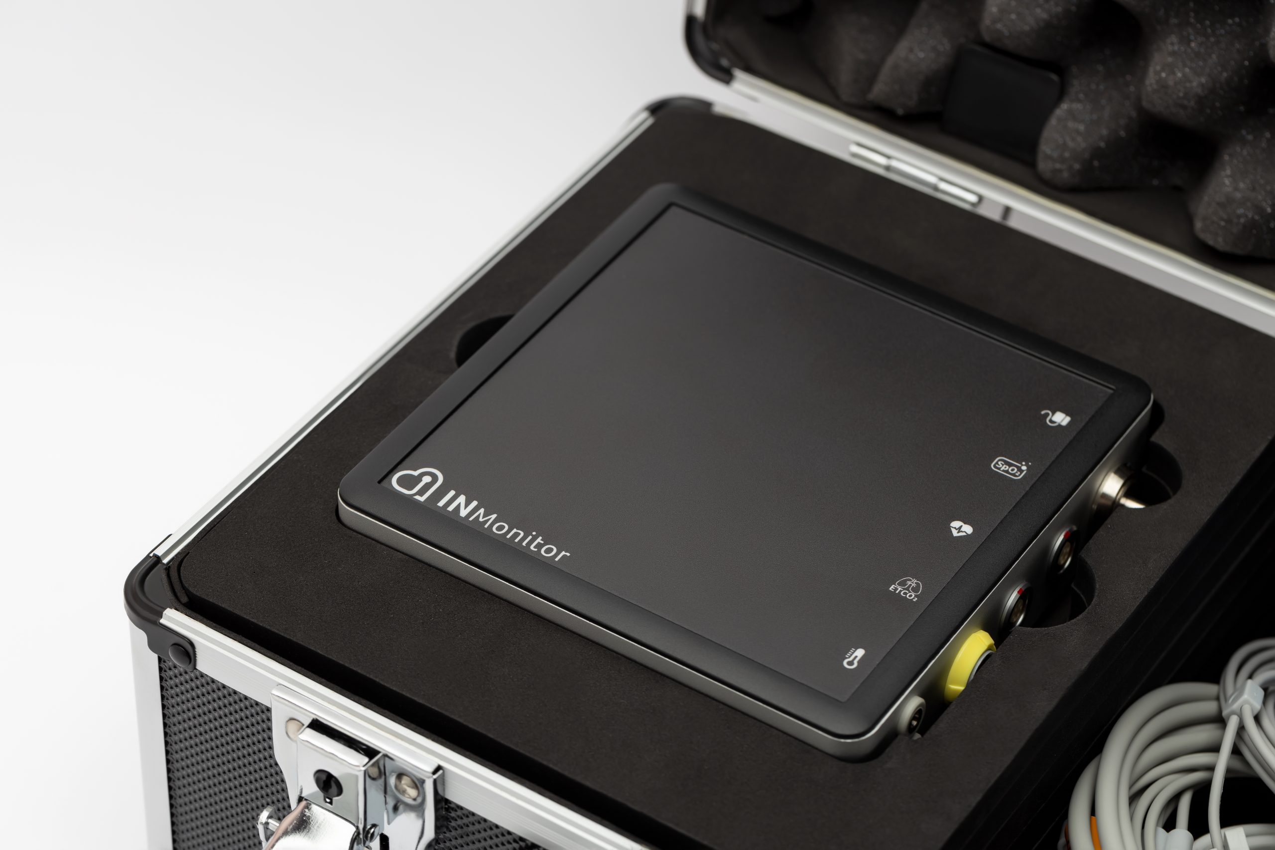 Contenido del paquete: Monitor multiparamétrico INmonitor, fuente de carga 12V, cable USB, cable de 5 vías para ECG, 5 electrodos cocodrilo, manguitos no 1 a 5, manguera de extensión para NIBP (PNI), sensor de saturación de oxígeno, 2 sensores de temperatura rectal/esofágica, módulo de capnografía de main-stream o side-stream (opcional), abrazadera de fijación y estuche de transporte.